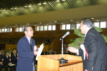 本年度は例年通りの体育協会表彰の部(功労賞・勲功章)に加え、財団化にあたりご尽力された3名の方に対し、その功績を称え、10周年記念の部として特別表彰が行われ、来賓、関係者を含めた260名の参加者から大きな拍手が送られました。
