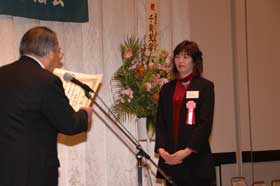 ![]() 日本体育協会より21年度公認スポーツ指導者表彰を受けた西沢マサ子さん(市卓球協会事務局長)にも花束が手渡された。 |