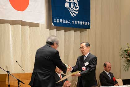 ![]() 平成25年度市体育協会功労賞の贈呈。受賞者代表の小林信夫さん(市レクリエーション協会)。 |